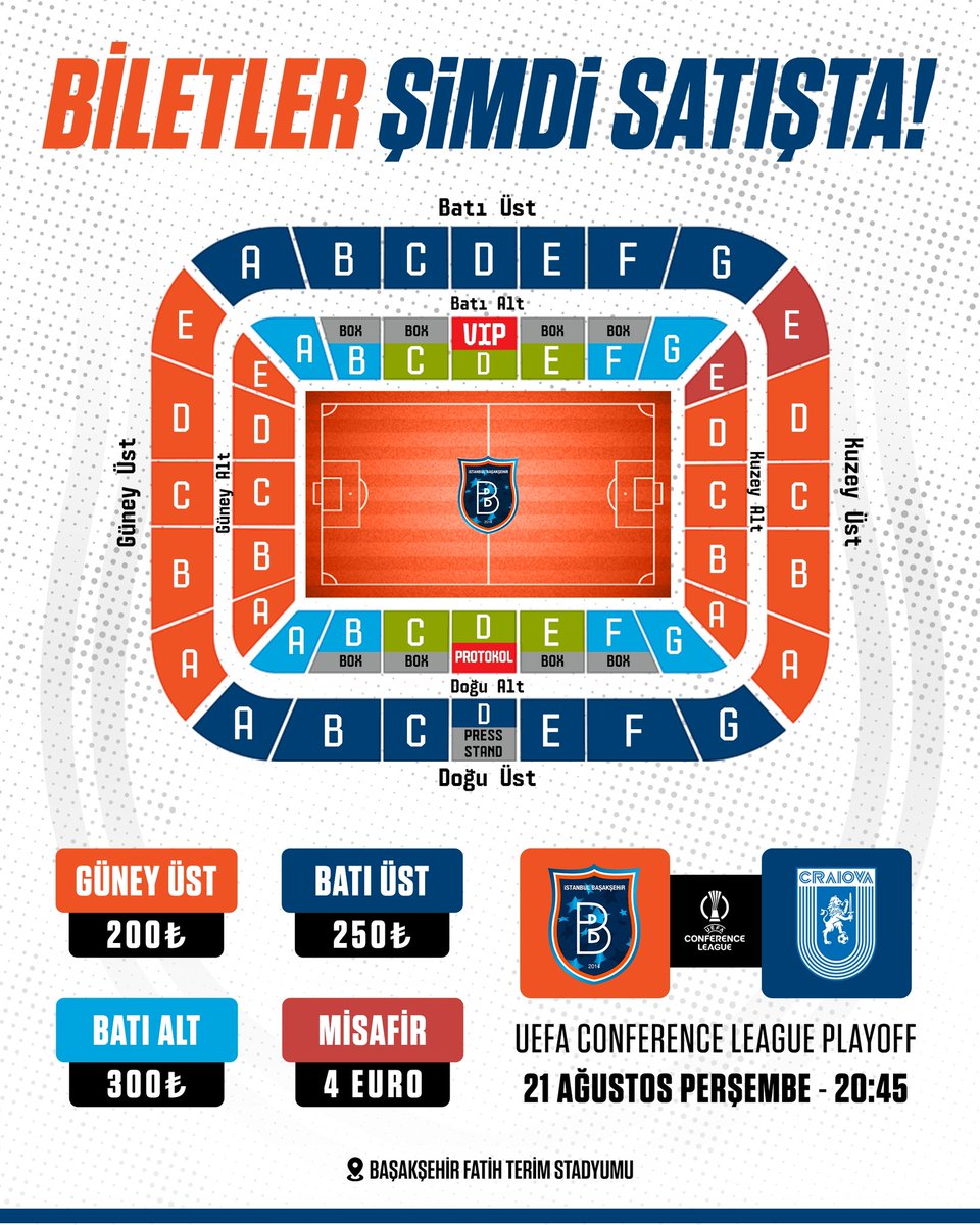 🎟️ UEFA Konferans Ligi Play-off Turu ilk maçında Universitatea Craiova ile 21 Ağustos Perşembe günü sahamızda oynayacağımız karşılaşmanın biletleri satışa sunuldu.