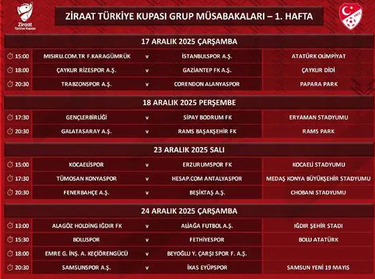 Ziraat Türkiye Kupası'nda grup kura çekimi yapıldı ve C Grubu'nun ilk maçında Fenerbahçe ile Beşiktaş derbisi oynanacak. Üç grupta toplam 8'er takım mücadele ederken, gruplarında ilk iki sırayı alanlar ile en iyi iki üçüncü çeyrek finale yükselecek ve seribaşı takımlar iç sahada oynayacak. Turnuvada tüm grup eşleşmeleri ve maç takvimi açıklanırken büyük takımların fikstürleri de netleşti.