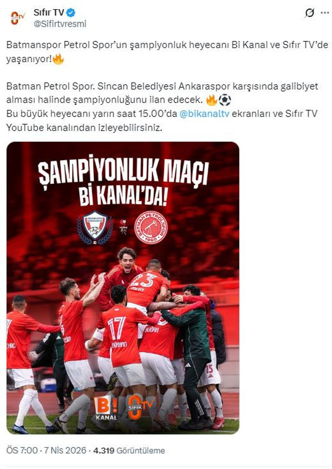 Tüm bu gelişmelere karşın Sıfır TV'nin resmi sosyal medya hesapları üzerinden yapılan duyuruda, Batman Petrolspor ile Sincan Belediyesi Ankaraspor arasında oynanacak kritik şampiyonluk mücadelesinin canlı yayınla ekranlara getirileceği belirtildi.
