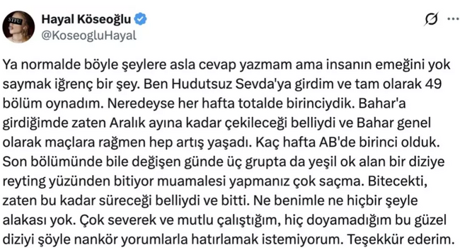 Hayal Köseoğlu, kendisi geldiği için dizinin final yaptığını iddia eden kullanıcıya, 'Ya normalde böyle şeylere asla cevap yazmam ama insanın emeğini yok saymak iğrenç bir şey. Ben Hudutsuz Sevda'ya girdim ve tam olarak 49 bölüm oynadım. Neredeyse her hafta totalde birinciydik. Bahar'a girdiğimde zaten Aralık ayına kadar çekileceği belliydi ve Bahar genel olarak maçlara rağmen hep artış yaşadı. Kaç hafta AB'de birinci olduk. Son bölümünde bile değişen günde üç grupta da yeşil ok alan bir diziye reyting yüzünden bitiyor muamalesi yapmanız çok saçma. Bitecekti, zaten bu kadar süreceği belliydi ve bitti. Ne benimle ne hiçbir şeyle alakası yok. Çok severek ve mutlu çalıştığım, hiç doyamadığım bu güzel diziyi şöyle nankör yorumlarla hatırlamak istemiyorum. Teşekkür ederim.' diyerek cevap verdi.