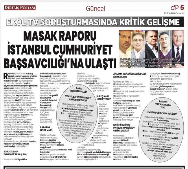 İktidara yakın Diriliş Postası gazetesinin manşet haberine göre, EKOL TV soruşturmasında Mali Suçları Araştırma Kurulu (MASAK) tarafından yürütülen mali inceleme raporu tamamlanarak, İstanbul Cumhuriyet Başsavcılığı'na gönderildi.